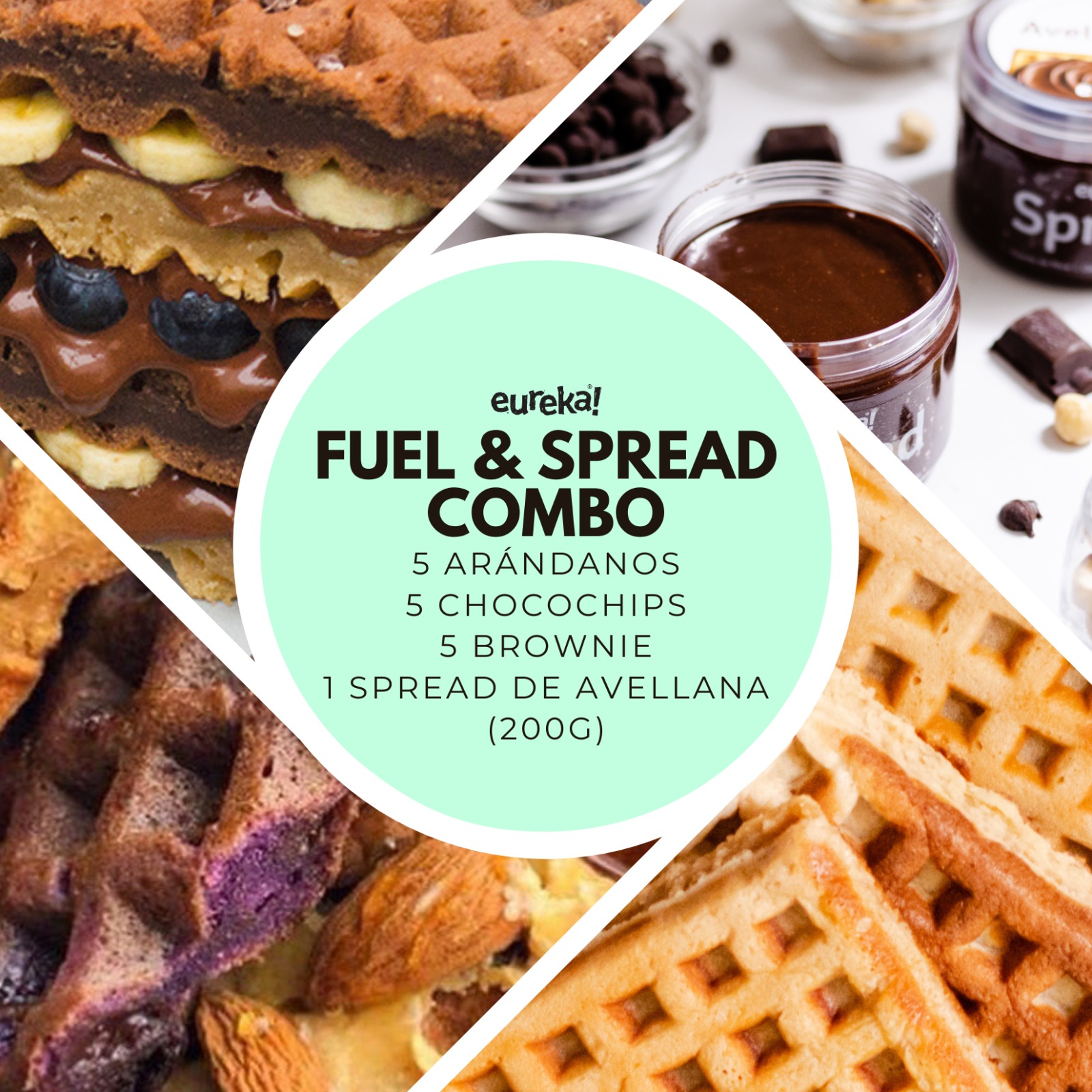 5 WAFFLES ARANDANOS + 5 WAFFLES CHOCOCHIPS + 5 WAFFLES BROWNIE + 1 SPREAD DE AVELLANA